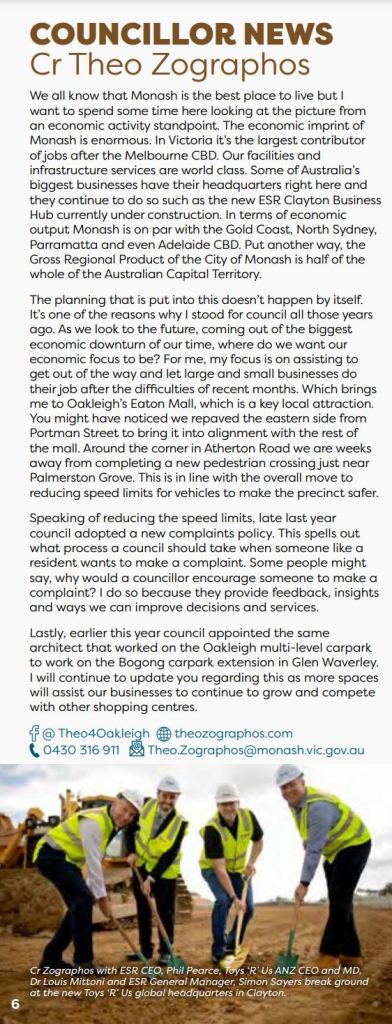 Councillor Theo Zographos was elected in 2012, 2016 and 2020 to represent Oakleigh in the Monash City Council.